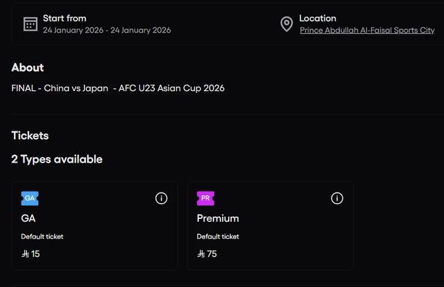 目前,决赛门票已通过亚足联官网及沙特官方票务平台正式发售,普通票15沙特里亚尔(约合人民币28元),优享票75沙特里亚尔(约合人民币139元)。决赛场地体育场容量约为27000人,截至22日上午,分配给中国队球迷的东看台北侧仍有部分普通票在售,票量较为充足。总领馆提醒广大球迷,务必通过官方渠道购票,切勿轻信非正规平台信息,避免财产损失或无法入场。同时请提前做好行程规划,观赛时文明有序,展现中国球迷良好形象。